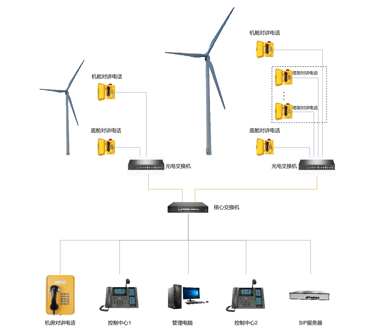 该架构确保风机现场、控制中心及设备机房之间的语音对讲稳定可靠,满足风电场运维调度需求,同时结构清晰,便于部署与维护。